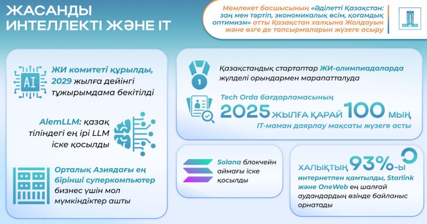 «2024-2025 жылдар ЖИ саласындағы маңызды бастамалар кезеңі болды. 2029 жылға дейінгі тұжырымдама бекітілді, ЖИ және цифрлық трансформацияны дамыту стратегиясы, сондай-ақ жасанды интеллекті бойынша заң жобасы әзірленуде», — деді Жаслан Мәдиев.